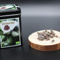 Die Kakaobohnen sind eigentlich der Samen und diese befinden sich zu 20-50 Stück in der Kakaofrucht, welche direkt am Stamm wächst. Für unsere Kakao Nibs werden die Bohnen mit dem Fruchtfleisch zunächst fermentiert und dann in der Sonne getrocknet. Bei der Fermentation verlieren die Bohnen einen Teil der Bitter- und Scharfstoffe, werden milder und entwickeln ausgeprägte Aromen. Einer der wichtigsten Inhaltsstoffe ist das Theobromin.