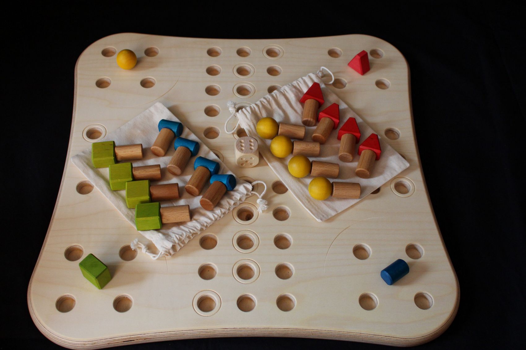 Die Spielfiguren und der Würfel sind aus Ahorn, Erle und Buche gefertigt
